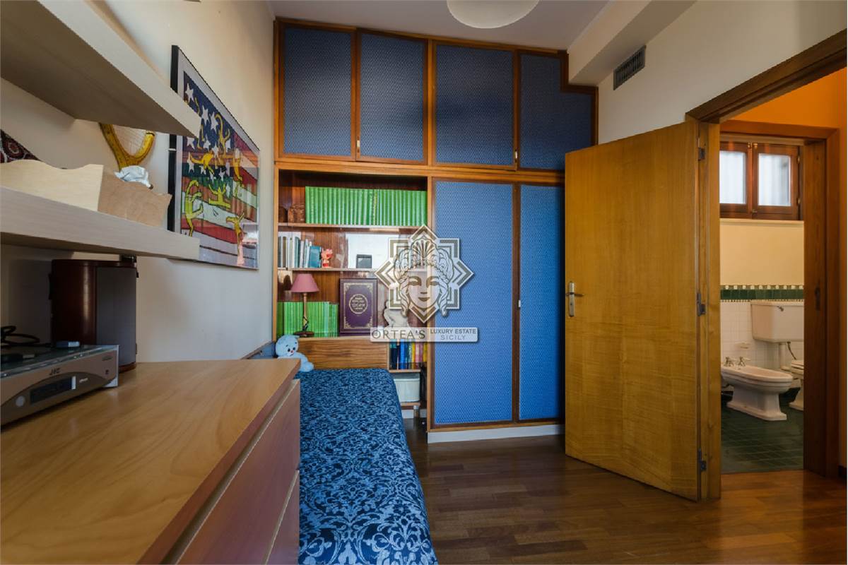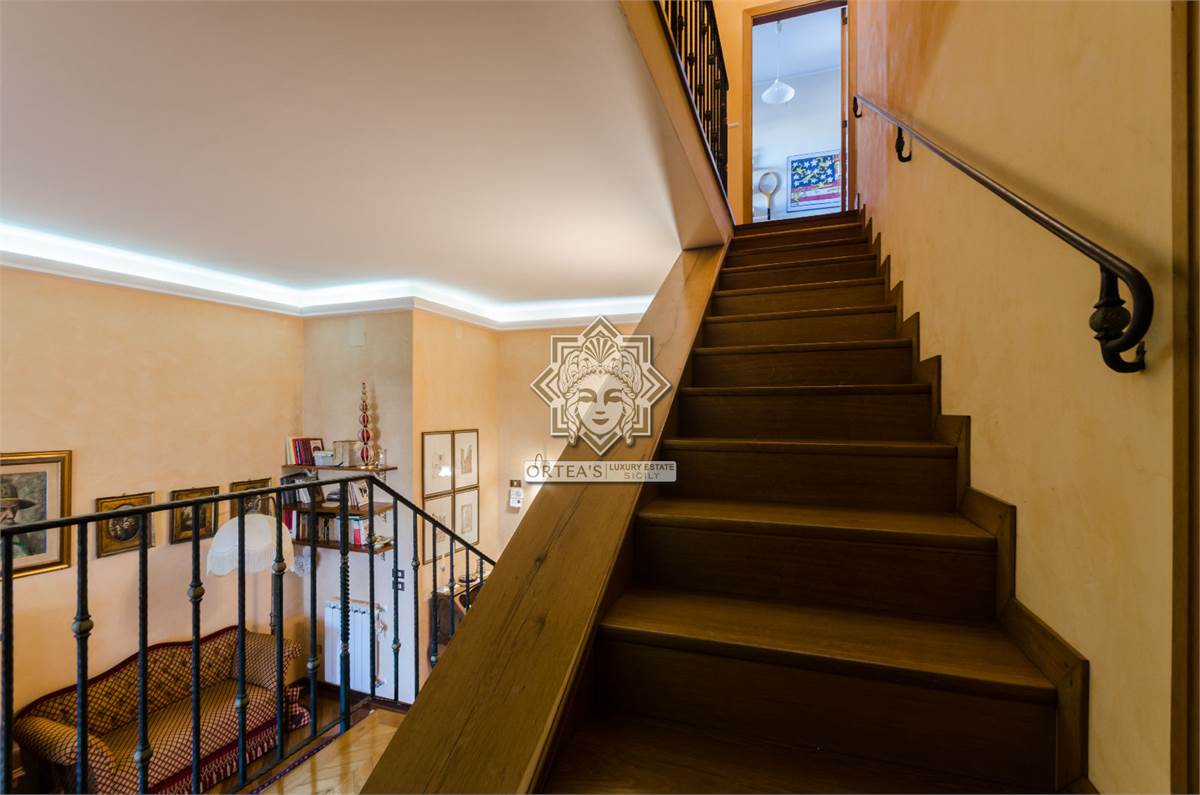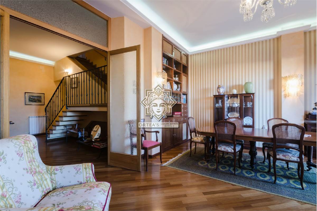 Questo appartamento signorile con finiture lusso si caratterizza per essere su due livelli, per la presenza di due terrazzi vista mare e per la presenza di una scala in legno massello ed una pregevole balaustra in ferro battuta che mette in comunicazione i due piani interni.